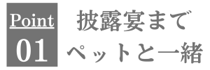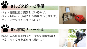 ペット専用控室、披露宴会場で使えるサークル、ワンちゃん用衣装など、安心して楽しめる環境を完備。
