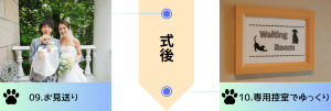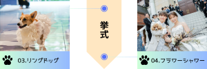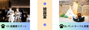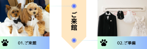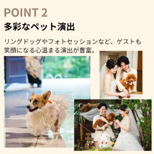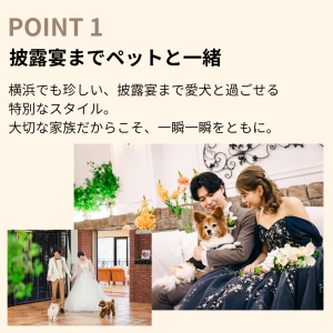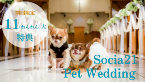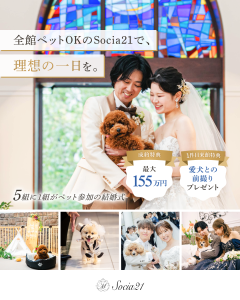 リングドッグ・肉球結婚証明書・わんちゃんファーストバイトなどペットと一緒に憧れの演出が叶えられるのはSocia21ならでは!当日の過ごし方やペット同伴での不安点なども専属プランナーと相談しながら決めていこう!