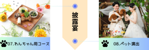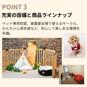 挙式でのリングドッグ演出、披露宴での再入場先導、ペット用ケーキでのファーストバイトなど、 ペットが主役になれる人気演出を体験できるのもこのフェアだけ。「うちの子と本当に結婚式できるのかな…?」 そんな不安が、フェアに参加するだけで“楽しみ”に変わるはず。家族みんなで迎える結婚式の第一歩をこのフェアから始めてみませんか。
