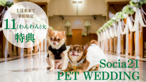 ペットと一緒に結婚式を挙げたいと考えているカップル様専用のプランが登場!期間限定の11大(わんわん)特典付きのプランは、大切なゲストをお迎えするウェルカムドッグやチャペル挙式のリングドッグ入場、証明書への肉球署名、ペットの可愛い姿が沢山見られるのはペットウェディングになること間違いなし♪